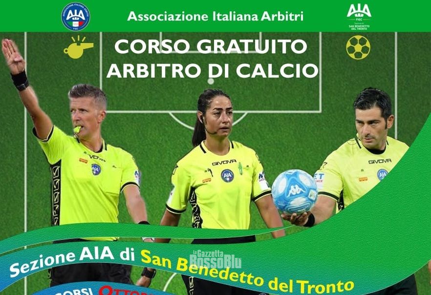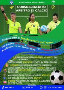 L’Associazione Italiana Arbitri indice il CORSO NAZIONALE PER ARBITRI DI CALCIO per la stagione sportiva 2023/2024. La locale Sezione ARBITRI di San Benedetto del Tronto comunica che l’inizio del corso avverrà Lunedì 9 Ottobre 2023 alle ore 18:30 e avrà la durata di circa 8 settimane, con lezioni di 1 ora e ½ per due volte a settimana, negli orari serali.