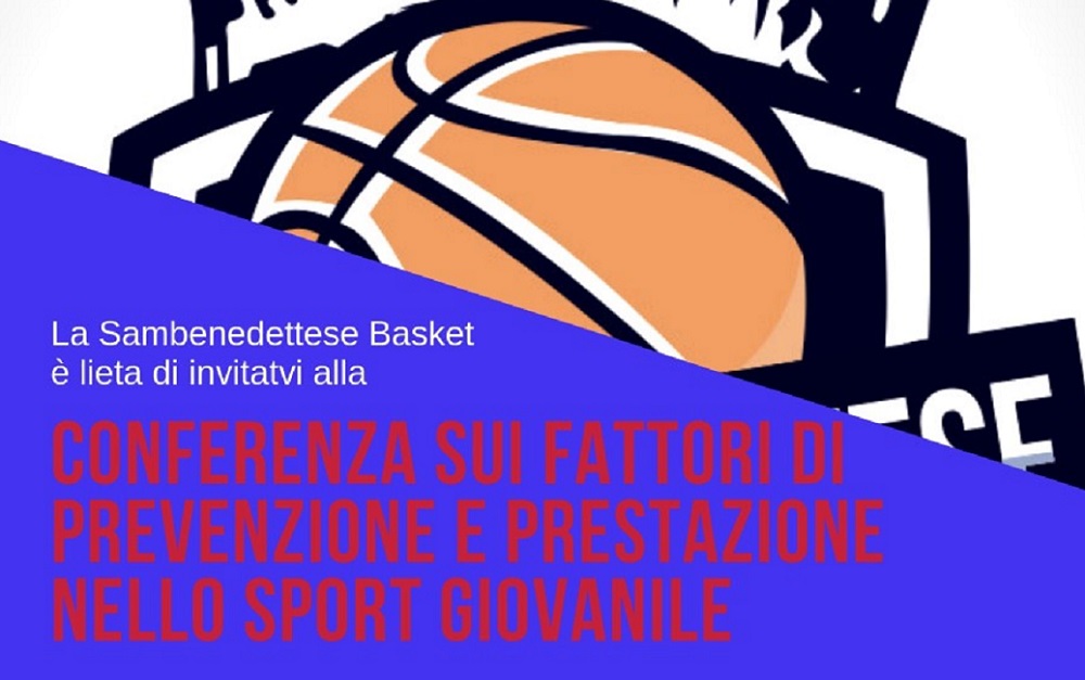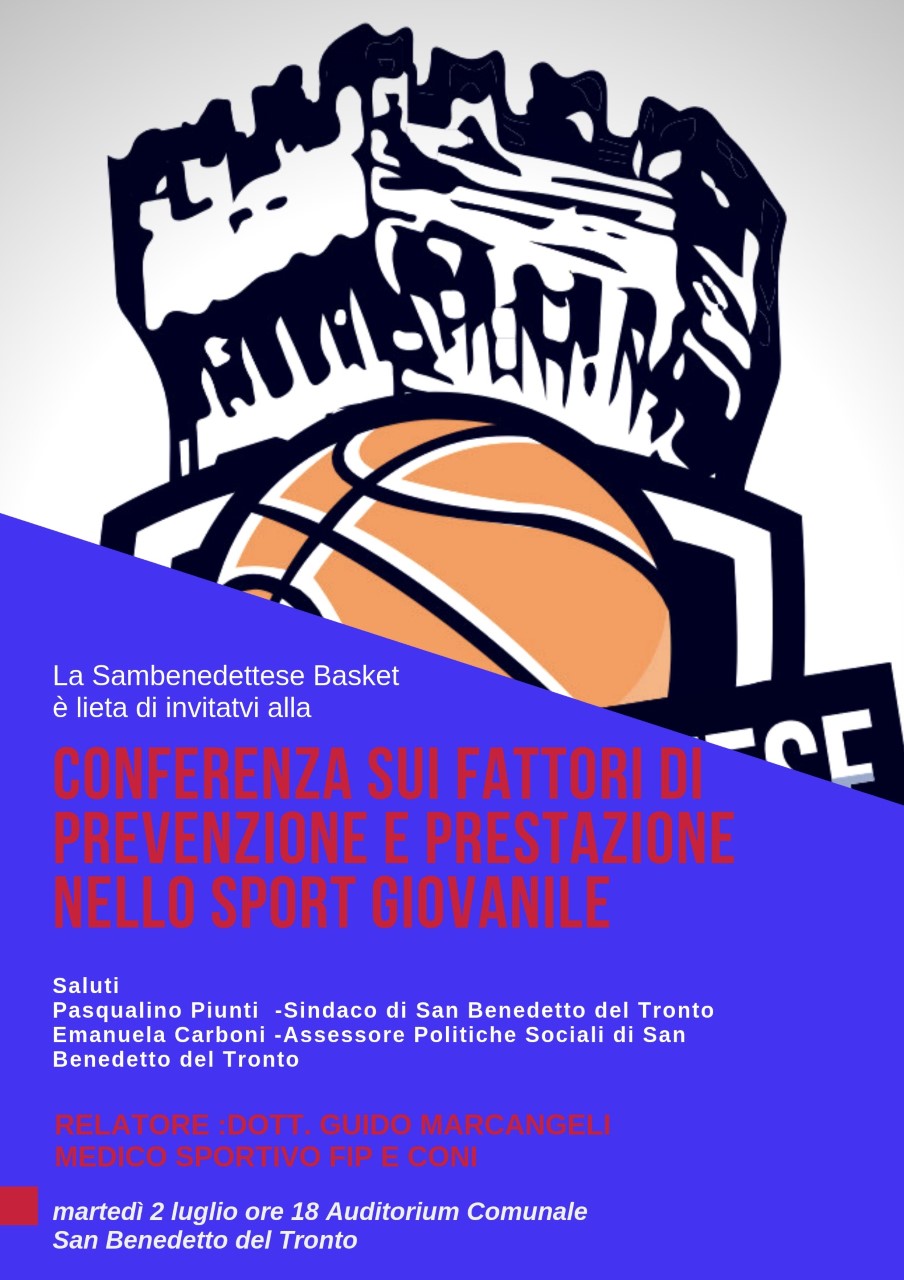 La Sambenedettese Basket organizza con il patrocinio del Comune di San Benedetto del Tronto e dell’Assessorato alle Politiche Sociali Emanuela Carboni una conferenza sui fattori di prevenzione e prestazione nello sport giovanile. Relazionerà il Medico Sportivo della Nazionale Under 18 di Pallacanestro Maschile Dott. Guido Marcangeli.