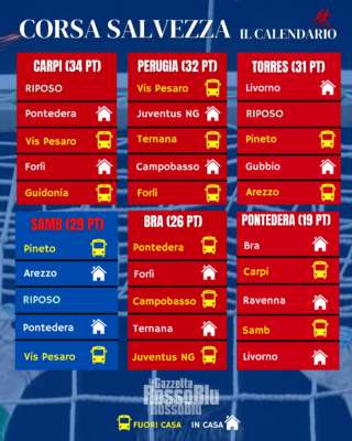Se il Pontedera, che ad oggi non sembra destare importanti preoccupazioni di classifica, rappresenta una ulteriore ancora di salvezza – in caso di distacco superiore agli otto punti dalla quart’ultima classificata al termine della regular season verrebbe meno la disputa del match play-out -, Bra (26 punti), Torres (31 punti), Perugia (32 punti) e Carpi (34 punti) sono a tutti gli effetti spine nel fianco, minacce e obiettivi su cui concentrare tutte le forze da qui al 26 aprile.