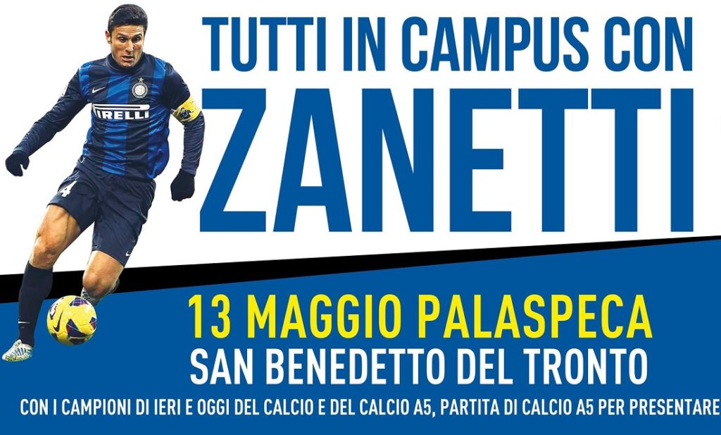 Javier Zanetti a San Benedetto. Lo storico capitano e ora vicepresidente dell’Inter giocherà una partita di Calcio A5, insieme ad altri volti illustri dello sport, per presentare il campus estivo che si terrà a giugno a San Benedetto del Tronto sotto l’egida del Torrione e un altro campus estivo che si terrà invece a Montegranaro. L’appuntamento, che richiamerà inevitabilmente tanti appassionati sportivi, è per il 13 maggio alle ore 20:00 al Palaspeca ed è anche patrocinato dal Comune di San Benedetto.