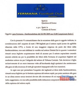 Sono molto impegnativi i preparativi per Fermana-Samb, almeno sotto il profilo logistico. Nelle ultime ore, infatti, il club canarino attraverso il suo sito internet ha fatto sapere che aveva sollevato alcune criticità alla Questura di Fermo, legate all’esigenza dei tifosi della Samb di più biglietti rispetto alla capienza del settore ospiti (700 posti). La Fermana, con una nota inviata alla Questura e per conoscenza al Comune di Fermo, aveva chiesto di bloccare la vendita per il settore Distinti Est, dove si sarebbero potute verificare delle commistioni tra le due tifoserie, e di valutare la possibilità di aumentare la capienza del settore ospiti per garantire un solo spazio alla tifoseria sambenedettese. Eventualità, questa, che non è stata però avallata dagli organi competenti, visto che nel tardo pomeriggio di oggi (venerdì, ndr) è stata aperta la prevendita per il settore Distinti Est, riservato alla fazione rossoblù. Di seguito riportiamo la nota condivisa dalla Fermana sul proprio sito ufficiale.