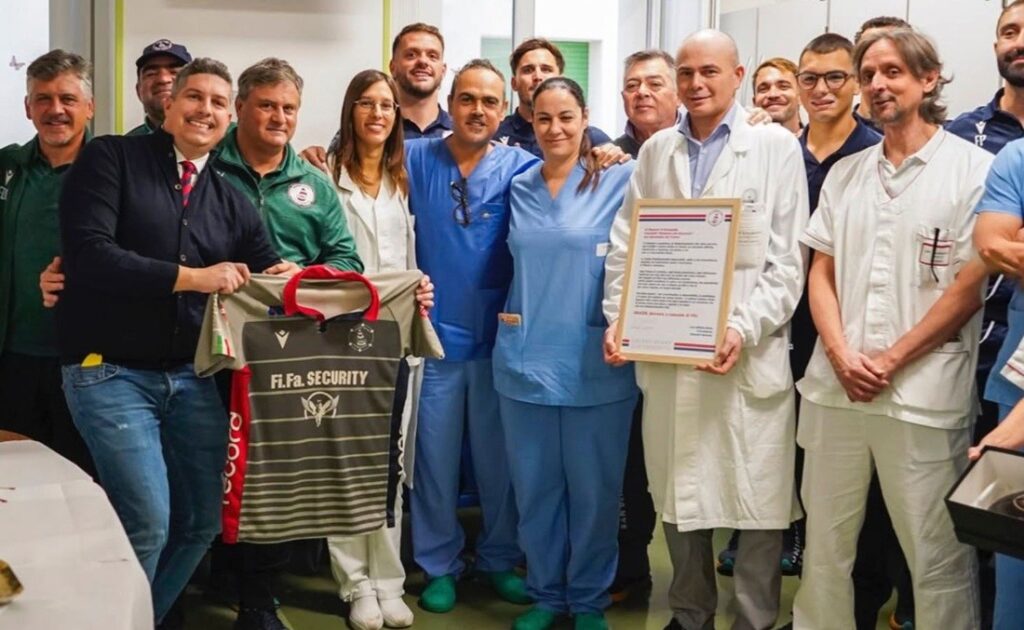 Il primo riconoscimento è arrivato ad Ascoli Piceno, nella cornice di Palazzo dei Capitani, durante la Festa dello Sport del CONI. L’Unione è stata premiata non solo per la storica promozione, ma per essere un modello di crescita sostenibile. Un tributo che conferma il progetto rossoblù come un’eccellenza regionale ormai riconosciuta. Ma il rugby è soprattutto sostegno. In questo contesto nasce il profondo legame con il Reparto di Ortopedia dell’Ospedale Madonna del Soccorso di San Benedetto. Più che una partnership formale, è un’alleanza etica nata dall’esperienza diretta di un giovane atleta infortunato, accolto con straordinaria cura.