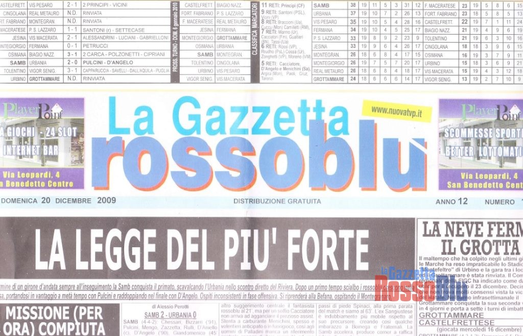 È lieto il finale del 2009, annus horribilis rossoblù (oltreché per l’economia nazionale ed internazionale), dopo mesi e mesi di delusioni e tribolazioni: la Samb batte l’Urbania con punteggio all’inglese nel match prenatalizio ed aggancia in solitaria la vetta dell’Eccellenza. Da questo confortante e promettente epilogo riavvolgiamo il nastro, tornando al dopo-Lecco, quando piovve sul bagnato, che aveva già allagato il nostro ambiente con la retrocessione ai playout in Seconda Divisione. Ebbene questa categoria la Samb non l’avrebbe nemmeno disputata, dopo averla vinta due volte su due partecipazioni (1990/91 e 2001/02), perché la situazione della società gestita dai fratelli Tormenti precipitò definitivamente a causa del loro arresto e del successivo blocco dei loro conti correnti. Ci ritrovammo così in un “deadlock”, da cui fu impossibile uscire nonostante le trattative intavolate e le buone intenzioni del papabile successore Sergio Spina. Nisba, il presidente Macalli dichiarò la Samb “out” dal professionismo per la seconda volta nella sua storia dopo il 1994. Fu fatto un tentativo di ripartire dal gradino inferiore, quello della Serie D, con l’intervento anche del sindaco Gaspari, ma la regola di scendere almeno di due categorie in quell’occasione, a differenza di tante altre, trovò inflessibile applicazione. Ed ecco allora spalancarsi le porte dell’Eccellenza, come era già avvenuto nel 1994/95, serie in cui si ricostituì una società con Spina presidente, coadiuvato dal commercialista Roberto Pignotti e dall’imprenditore Claudio Bartolomei.