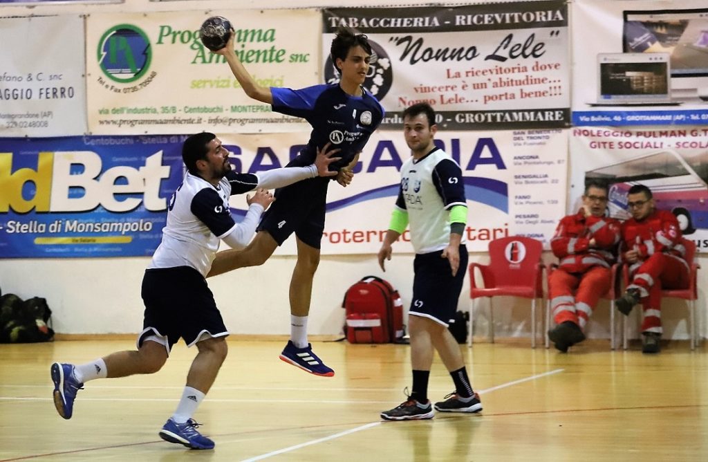 Zero sorprese, nessuna trappola: l’HC Monteprandone fa valere il peso della sua classifica e vince facile sul parquet del fanalino di coda del girone Marche-Abruzzo di serie B. Contro L’Aquila, il 35-26 finale in favore dei blu racconta tutto o quasi. Per l’HC il ritorno al successo (il numero 10 della stagione) dopo la sconfitta di Falconara e il pari casalingo contro la capolista Cus Chieti si materializza in un amen, con il 7-2 in avvio che anticipa la tranquilla serata sotto il Gran Sasso. Le parate del solito Giambartolomei e un Parente in grande forma infondono sicurezza a Monteprandone e nonostante la prestazione molle di parte di qualche elemento, la squadra di coach Andra Vultaggio riesce ad andare al riposo sul 17-11 e a inaugurare la ripresa sulla stessa falsariga. Anzi, meglio. Tanto che nella seconda frazione di gioco l’HC tocca anche il +13. Così nel finale spazio per tutti, compreso quel Wasim Khouaja, il classe 2006 prodotto del vivaio blu e fratello del Waeil in presto al Ferrara United in serie A2, che all’esordio timbra il cartellino. “Finalmente una trasferta serena” è il commento di coach Vultaggio. “Devo ammettere che prima della partita non ne ero così sicuro: lontano dal Colle Gioioso ci è capitato spesso di sbagliare qualcosa di troppo. Ma per fortuna è andata. Di certo devo ancora lavorare sulla testa di alcuni dei miei ragazzi. Ci servirà ben altra verve per il derby di sabato prossimo contro Chiaravalle: vorremmo rifarci per la sconfitta troppo severa dell’andata” auspica Vultaggio. [Questi i giocatori schierati dall’HC a L’Aquila e le rispettive marcature: Giambartolomei, A. Di Girolamo, Campanelli 2, Lattanzi 3, Parente 6, Funari 2, Coccia 5, Pantaleo 7, Carlini 1, Salladini, Tritto, Khouaja 1, Cani 5, Mattioli 3.