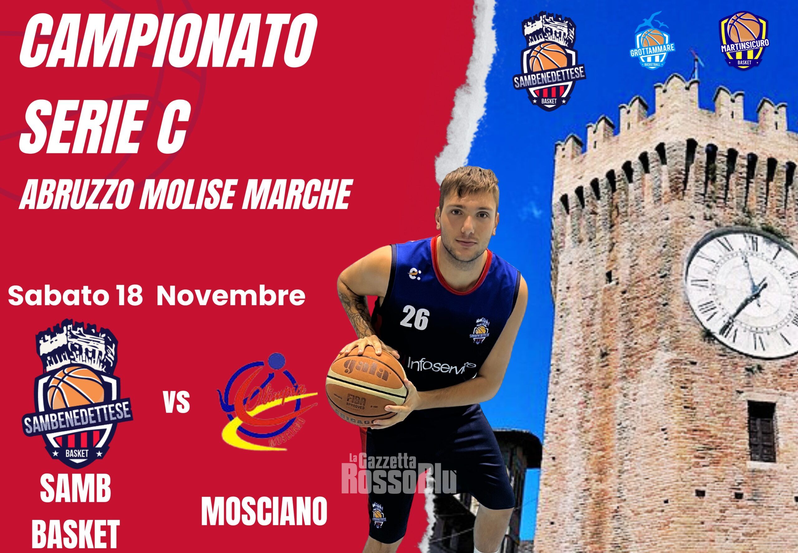 L’ Infoservice Sambenedettese Basket, Grottammare Basketball, Martinsicuro Basket, Acquaviva Basket è pronta a tornare in campo dopo il successo esterno di Torre de’Passeri. Sabato 18 novembre i Rossoblù di Coach Micucci affronteranno l’Olimpia Mosciano dell’ex Bontà.