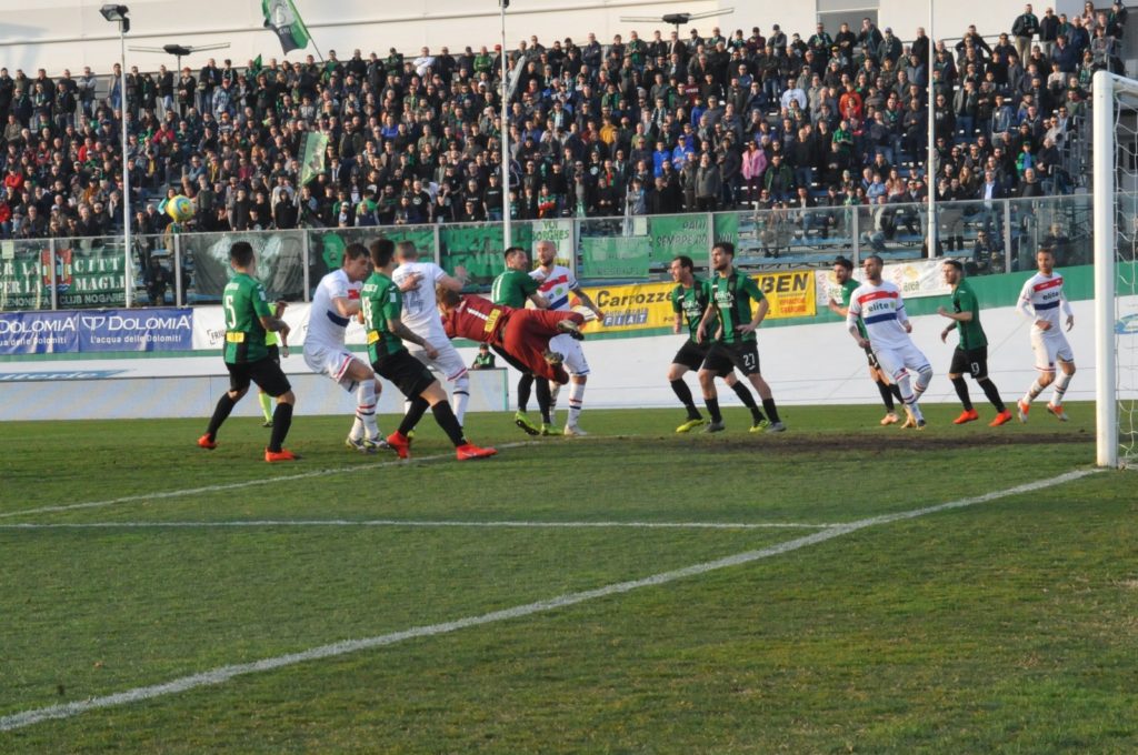 Positivo doveva essere il risultato e un pari arriva dal Bottecchia. Gara accesissima quella tra Samb e Pordenone che trova il vantaggio con un eurogol di Gavazzi a cui risponde Fissore. Parte fortissimo la Samb, la cui intenzione in questa gara è far tremare il Pordenone. Botta e risposta nei primissimi minuti con Berrettoni e Fissore alla conclusione, Sala e Bindi inoperosi. A provarci, e far tremare però il palo, è Russotto che si presenta a battere un piazzato sull’esterno destro dell’area di rigore neroverde. Il colpo del fantasista, a sorpresa, è preciso, ma la sfera si stampa sul legno. E allora è Gavazzi a spaccare la gara. Al quarto d’ora, il numero 7, estrae il cilindro dal cappello e trova un colpo impressionante dai venti metri che batte Sala e si insacca: 1-0. La Samb non si abbatte, Roselli si sbraccia in panca e i suoi in campo reagiscono. Passano appena dieci minuti quando De Agostini tocca con la mano un cross di Rapisarda. Mercenaro comanda il calcio di punizione e di nuovo si presenta Russotto. Il 32 nel mucchio pesca il barbuto Fissore che di testa fissa il risultato sul pari e si gode la sua prima marcatura con la maglia della Samb sulle spalle. Le squadre si affrontano senza alcun timore. È priorità della Samb abbassare i ritmi nel momento in cui il Pordenone punta alle verticalizzazioni rapide verso il duo Ciurria-Candellone. La prima frazione, in ogni caso, va a chiudersi senza altre emozioni dopo, comunque, un avvio brillante. Tesser cambia nell’intervallo: sotto la doccia vanno Bombagi e Berrettoni, entrano rispettivamente Rover e Zammarini con Ciurria che va a sistemarsi dietro le punte. Una costante nella formazione di Roselli è invece l’avvicendamento tra Russotto e Ilari con il fantasista spesso impegnato a costruire la manovra sulla mediana e l’ex Teramo più avanzato e vicino a Stanco. Il primo squillo della ripresa è di Candellone, ma Sala è attento sul suo palo e blocca a terra. Ancora un cambio per Tesser che ora nella mischia butta pure Magnaghi, dal canto suo Roselli gli risponde: dentro Di Massimo e Rocchi. Al 20’ brivido rossoblù: Russotto raccoglie sulla trequarti e prova a sparare di destro, la conclusione è destinata sul fondo ma sulla traiettoria si mette Ilari che devia di testa e sorprende tutti sfiorando la porta. La Samb si copre in maniera molto ordinata di fronte al rinnovato attacco ramarro, ma Gavazzi scappa via al 28’ e Rocchi per fermarlo si becca il giallo e deve regalare un piazzato agli avversari. Lo stesso Gavazzi va sulla mattonella designata e la conclusione sorvola di un paio di centimetri la traversa. Sale l’incitamento dei 61 cuori sambenedettesi che, se non per numero almeno per voce, provano a farsi sentire al Bottecchia. In campo Miceli e soci provano a seguire la Nord facendo tremare in un paio di occasioni le gambe a Bindi, ma senza mai rendersi concretamente pericolosi. A far massa nella metà campo ospite è il Pordenone, ma i compiti di Sala si attengono alla semplice amministrazione con qualche intervento fuori dai pali. Roselli inquadra il centrocampo con Caccetta, dopo aver ricomposto la difesa con Celjak e Fissore sugli esterni e Biondi-Miceli in mezzo. Il forcing continuo dei neroverdi, seppur intenso e commovente, si dimostra inconcludente e la sfida va in archivio, dopo 5’ di recupero, con l’1-1 acquisito nella prima frazione. I rossoblù mercoledì saranno attesi dal recupero della gara di andata contro la Ternana, fresca reduce dalla sconfitta interna col Monza.
