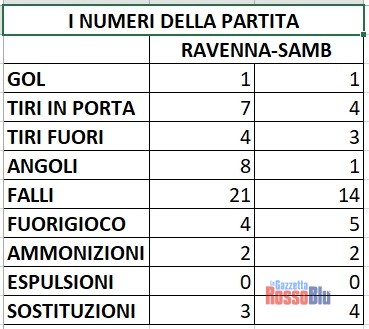 Più Ravenna che Samb. A dispetto dell’evoluzione temporale del match, con i giallorossi che hanno trovato il gol del pareggio soltanto nel recupero del secondo tempo, le statistiche della sfida del Bruno Benelli parlano di un incontro in equilibrio, con la Samb che non ha fatto molto di più rispetto ai suoi avversari. Anzi. La squadra di Mauro Zironelli ha calciato molto meno rispetto ai suoi avversari: 11-7 il computo dei tiri totali, 7-4 quelli nello specchio. In maniera ancora più netta anche i calci d’angolo sono stati di marca giallorossa (8-1). Sul piano disciplinare, invece, gli ospiti sono stati più corretti con 14 falli a fronte dei 21 del Ravenna; pari, invece, il conto delle ammonizioni (2-2).