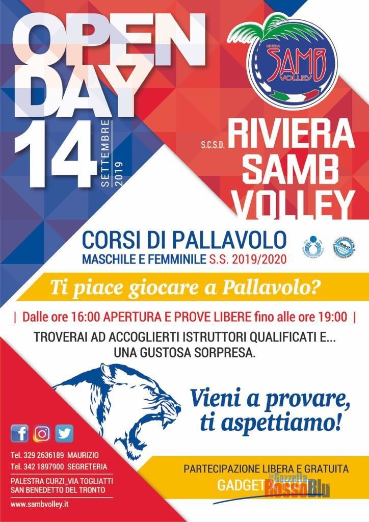 Un intero pomeriggio dedicato alla diffusione e alla promozione della pallavolo. Sabato 14 settembre alla Palestra Curzi di San Benedetto ci sarà l’Open Day della Riviera Samb Volley. Un evento da non perdere per tutti coloro che vogliono scoprire e approcciarsi ad una disciplina che ha nelle Marche il punto di riferimento nazionale grazie alle vittorie della Lube Civitanova (Scudetto e Champions League) e non solo. Dalle ore 16:00 i partecipanti troveranno istruttori qualificati e fino alle 19:00 potranno provare gratuitamente e liberamente. Un evento importante per la società rivierasca, punto di riferimento locale fin dal 1978 e che di anno in anno vede crescere l’attività del suo settore giovanile. Non mancheranno gadget e sorprese per coloro che si recheranno presso la Palestra Curzi, sede delle gare dei rossoblù. Continua, intanto, la preparazione delle varie formazioni sambenedettesi, su cui spicca la prima squadra femminile che è stata ammessa al campionato di Serie C.