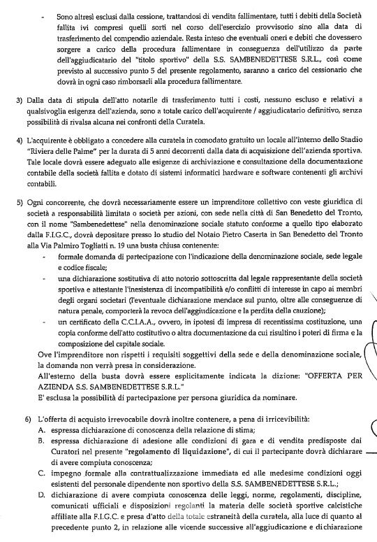 È stato pubblicato poche ore fa il regolamento di liquidazione della Samb, dichiarata fallita nei giorni scorsi. Nel documento, che è stato validato dal Tribunale di Ascoli Piceno, viene specificato che entro mercoledì 19 maggio dovranno essere presentate – presso lo studio del notaio Pietro Caserta – le offerte di acquisto che dovranno essere di almeno 400.00 euro. Nel caso in cui dovessero ne dovessero pervenire più di una allora si procederà con una procedura competitiva (asta), con base che sarà uguale a quella dell’offerta più alta e con rilanci di almeno 20.000 euro. Nel regolamento di liquidazione, però, si fa riferimento anche ad altri numeri che riguardano la società sportiva, come quelli relativi alla massa debitoria che è stata stimata dal dottor Saverio Mancinelli. Il debito sportivo della Samb, infatti, ammonterebbe a circa 1.940.000 euro, somma che – come è riportato nel documento validato dal Tribunale – potrebbe essere rivista al ribasso nel caso in cui venissero utilizzate le fidejussione escusse dalla Lega (importo di 730.000 euro). Di seguito riportiamo alcuni estratti del regolamento, che può essere consultato integralmente al sito www.fallimentiascoli.com.