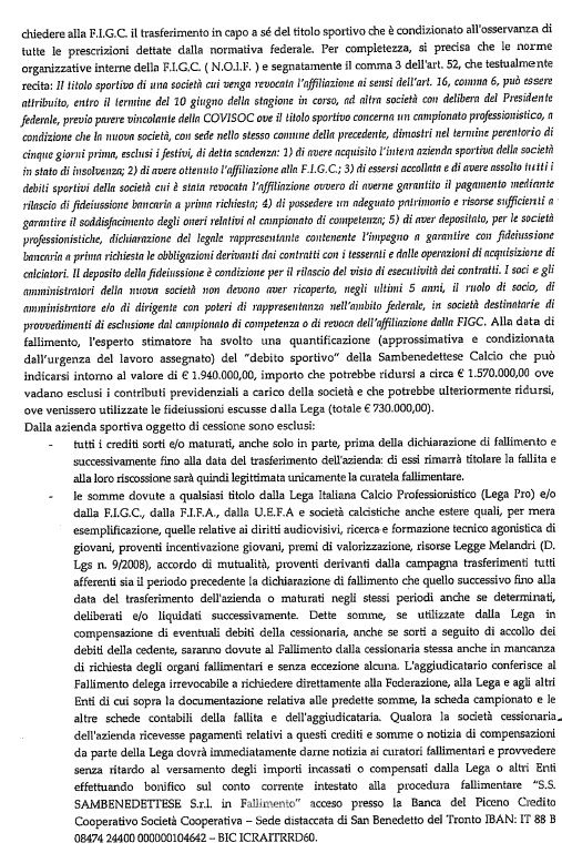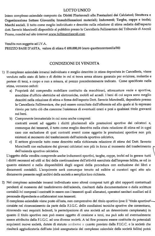È stato pubblicato poche ore fa il regolamento di liquidazione della Samb, dichiarata fallita nei giorni scorsi. Nel documento, che è stato validato dal Tribunale di Ascoli Piceno, viene specificato che entro mercoledì 19 maggio dovranno essere presentate – presso lo studio del notaio Pietro Caserta – le offerte di acquisto che dovranno essere di almeno 400.00 euro. Nel caso in cui dovessero ne dovessero pervenire più di una allora si procederà con una procedura competitiva (asta), con base che sarà uguale a quella dell’offerta più alta e con rilanci di almeno 20.000 euro. Nel regolamento di liquidazione, però, si fa riferimento anche ad altri numeri che riguardano la società sportiva, come quelli relativi alla massa debitoria che è stata stimata dal dottor Saverio Mancinelli. Il debito sportivo della Samb, infatti, ammonterebbe a circa 1.940.000 euro, somma che – come è riportato nel documento validato dal Tribunale – potrebbe essere rivista al ribasso nel caso in cui venissero utilizzate le fidejussione escusse dalla Lega (importo di 730.000 euro). Di seguito riportiamo alcuni estratti del regolamento, che può essere consultato integralmente al sito www.fallimentiascoli.com.