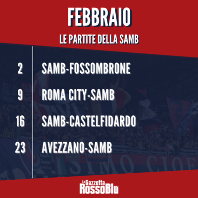 Dopo aver preso il largo, la Samb vuole consolidare la propria leadership nel girone F di Serie D. Nel mese di febbraio, i rossoblù allenati da Ottavio Palladini sono attesi da quattro impegni, equamente divisi tra casa e trasferta: si inizia dal match casalingo col Fossombrone (2 febbraio), poi la trasferta di Riano dove si affronterà il Roma City (9 febbraio), la gara del Riviera delle Palme col Castelfidardo (16 febbraio) e per concludere il mese (23 febbraio) la trasferta di Avezzano. Di seguito tutti gli impegni della Samb in foto.