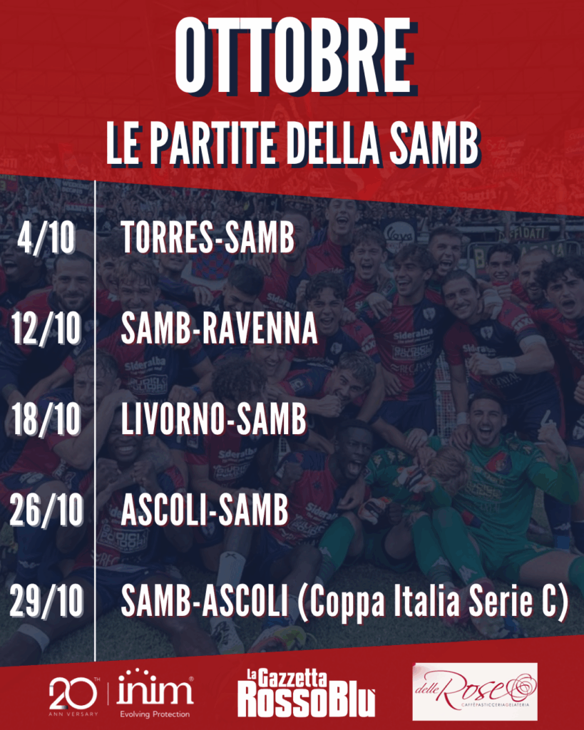 Cinque partite: quattro di campionato e una di Coppa, con tre trasferte e due impegni casalinghi. Ma soprattutto, il doppio derby con l’Ascoli. Questo il programma di ottobre per la Samb, che inaugurerà questo mese con il viaggio a Sassari, dove sabato 4 affronterà la Torres.