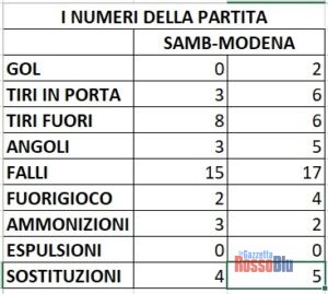 È mancata l’incisività alla Samb. Questo dicono i numeri della sfida col Modena: nonostante il punteggio nettamente a favore degli ospiti, le statistiche sono piuttosto in equilibrio. Quasi in parità il numero dei tiri totali (11-12), anche se la differenza vera l’hanno fatta i tiri in porta: 3-6 in favore della squadra di Mignani, dato che testimonia le difficoltà che ha avuto la Samb nel penetrare nell’area di rigore avversaria. Partita piuttosto corretta sul piano agonistico, con falli e ammonizioni praticamente in equilibrio.