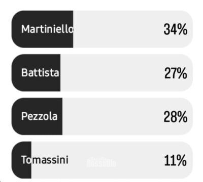 Alla domanda: “Tra Martiniello, Tomassini, Battista e Pezzola, chi eleggi come miglior rossoblù della stagione?“. Il 34% dei votanti (280 voti) ha espresso la sua preferenza verso Martiniello, il 28% (228 voti) Pezzola, il 27% (227 voti) Battista e l’11% (94 voti) Tomassini. Un risultato che non lascia scampo a dubbi: l’attaccante campano ha conquistato i cuori del popolo rossoblù grazie alla sua grinta, al suo carisma ed alla sua vena realizzativa.