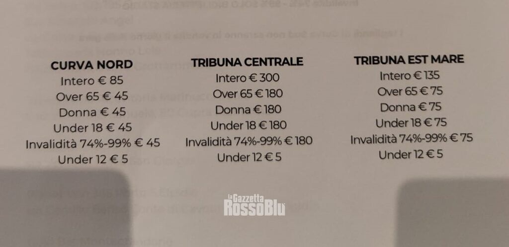 La biglietteria nord sarà aperta il giorno della gara, ma con orari ridotti (un’ora e mezza prima dell’inizio della gara e fino al fine primo tempo) e con un prezzo maggiorato di € 2,00 su ogni tipologia di biglietto ad eccezione dell’Under 12 che rimane sempre a € 1,00.