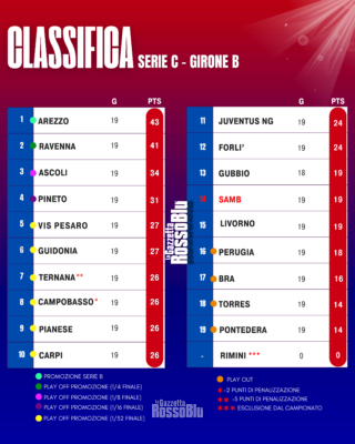 Di seguito riportiamo risultati e classifica del girone B di Serie C Sky Wifi dopo la 20^ giornata di campionato.