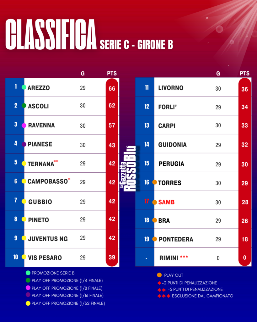 Di seguito riportiamo risultati e classifica del girone B di Serie C Sky Wifi dopo la 31^ giornata di campionato.