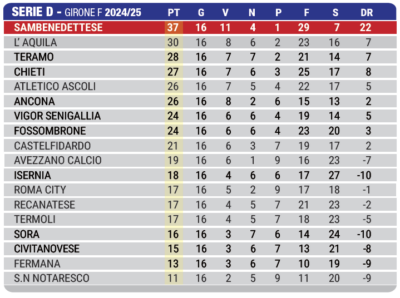 Di seguito riportiamo risultati, classifica e prossimo turno del girone F di Serie D dopo la 16^ giornata di campionato.