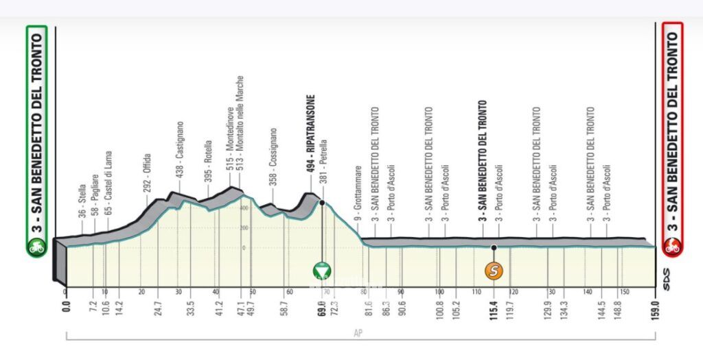 IL PERCORSO – I 159 km della frazione numero 7 si snoderanno però anche verso l’interno della provincia di Ascoli Piceno: dopo la partenza da San Benedetto il plotone guidato dalla maglia azzurra di Tadej Pogacar (che nella tappa d’alta quota sul Carpegna ha confermato la sua leadership) passerà per i comuni di Monsampolo del Tronto e Spinetoli lungo la Salaria (SS4), per poi spostarsi verso Offida (passando per Castel di Lama); giunti a Castignano si riprenderà a viaggiare in direzione est attraverso Montedinove, Montalto Marche, Cossignano e Ripatransone. Dopo essere scesi per Grottammare, poi, si percorrerà per 5 volte il circuito di 15km che si snoderà tra il centro e la parte sud di San Benedetto. Arrivo in volata in viale Buozzi.
