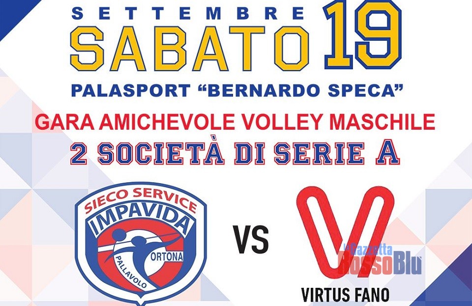 Domenica 19 settembre sarà un pomeriggio da non perdere al Palasport Speca, teatro di una gara tra due squadre della serie A maschile di pallavolo. A partire dalle 17 si affronteranno la Impavida Ortona e la Virtus Fano, militanti rispettivamente in serie A2 e in serie A3.